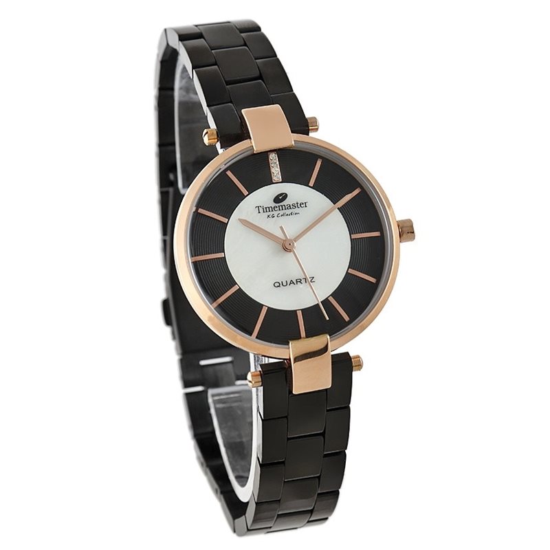 Piękny klasyczny zegarek. Prosty wzór bransolety zbudowanej z ogniw, które można skracać. Koperta okrągła z wypuszczonym pazurem przytrzymującym bransoletę. Tarcza dwukolorowa: czarna z delikatną fakturą, na której umieszczone są wyraźne indeksy w kolorze różowego złota oraz srebrna perłowa, na które umieszczone są wskazówki oraz logo producenta. Godzina 12 zaznaczona indeksem z cyrkoniami. Na zapięciu jest wytłoczone logo producenta.