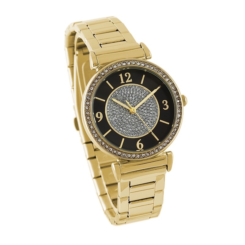 Zegarek na bransolecie z ogniw, z możliwością skracania. Okrągła koperta a na tarczy indeksy w postaci kresek, środek tarczy wysadzany cyrkoniami.