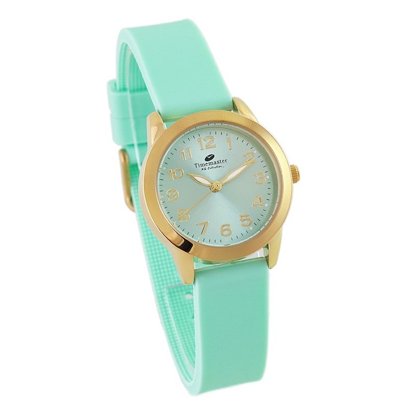 Miętowy zegarek z koperką w kolorze złota — idealny na lato i wiosenne stylizacje. Japoński mechanizm kwarcowy Miyota gwarantuje precyzję, a miękki gumowy pasek komfort noszenia przez cały dzień.