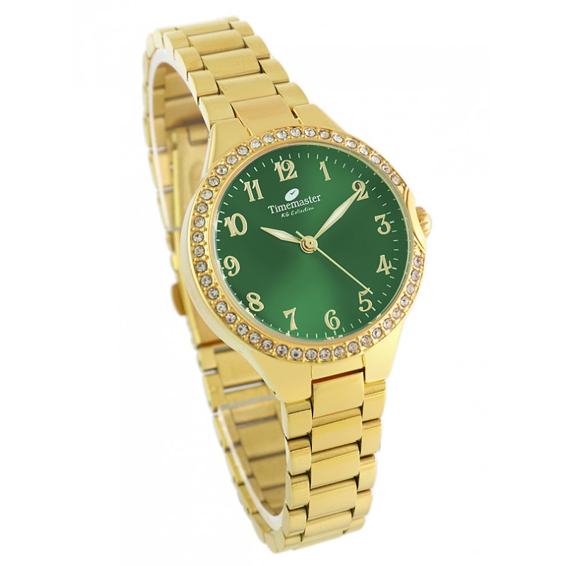 Podkreśl swój styl modnym akcentem koloru i blaskiem cyrkonii. Ten zegarek Timemaster w całości w lśniącym kolorze złota łączy klasyczną, biżuteryjną oprawę z nowoczesną, głęboko zieloną tarczą. Koperta została subtelnie ozdobiona lśniącymi cyrkoniami, co w połączeniu z zielenią i złotymi wskazówkami, tworzy luksusowy i wyrafinowany wizerunek. Subtelny rozmiar koperty i stalowa bransoleta gwarantują wygodę i trwałość na lata.