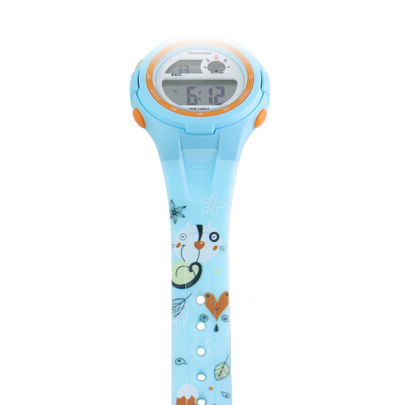 Jasnoniebieski pasek z rysunkami kotków natychmiast przyciąga wzrok, a duży wyświetlacz LCD sprawia, że cyfry są łatwe do odczytania nawet dla najmłodszych. Pomarańczowe akcenty na kopercie dodają energii, a cała konstrukcja została stworzona z myślą o aktywnych dzieciach — wytrzymała, lekka i bezpieczna do noszenia przez cały dzień.