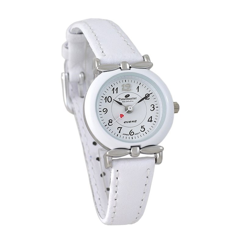 Biała tarcza z czytelnym napisem Event i logo Timemaster tworzy spokojną, harmonijną kompozycję. Koperta w odcieniu srebra łagodnie odbija światło, a miękki biały pasek z ekoskóry dopasowuje się do małego nadgarstka. Czerwone serduszko między cyframi 12 i 1 to subtelny znak miłości i radości z tego wyjątkowego dnia.