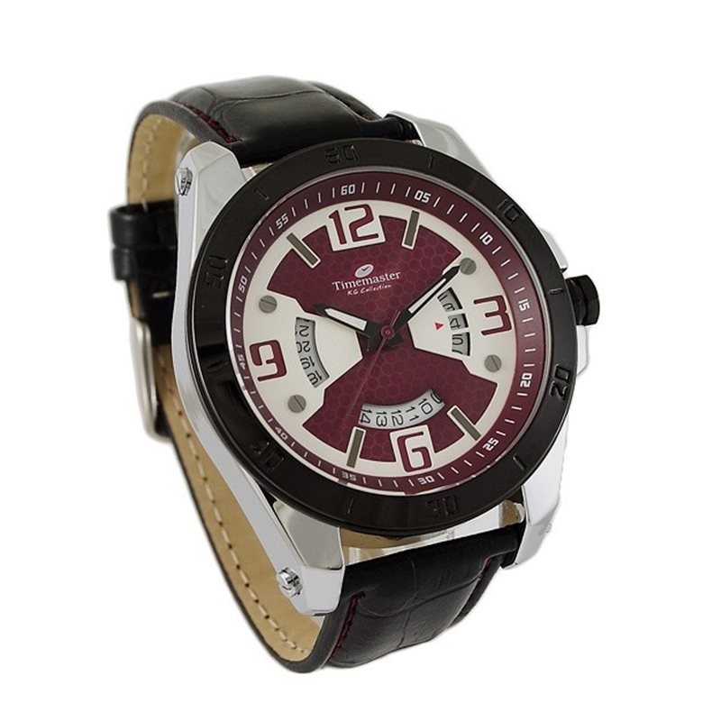 Okrągła koperta z czarnym ringiem i srebrną bazą. Tarcza bordowa z białą nakładką. Datownik pojedynczy ale w designerski sposób pokazany w różnych miejscach.