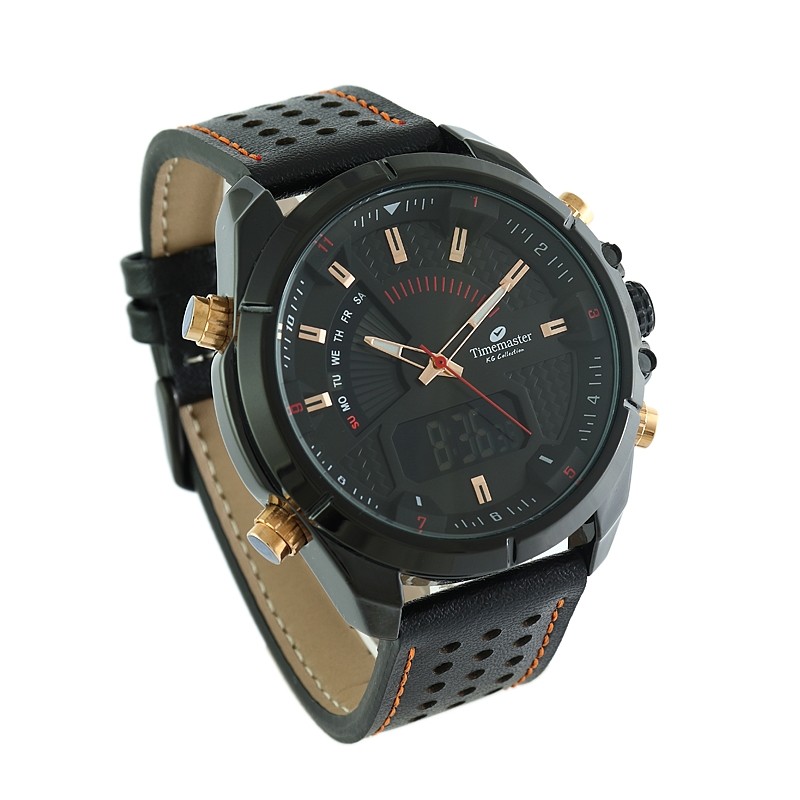 Elegancki i nowoczesny model hybrydowy Timemaster w monochromatycznej, czarnej oprawie, przełamany luksusowymi akcentami w kolorze różowego złota (rosegold). Ten czasomierz jest idealny dla podróżujących, ponieważ pozwala na śledzenie dwóch stref czasowych dzięki mechanizmowi analogowo-cyfrowemu. Bogaty zestaw funkcji, w tym stoper i podświetlenie, oraz pasek z naturalnej skóry łączą klasyczny wygląd z technologiczną przewagą.