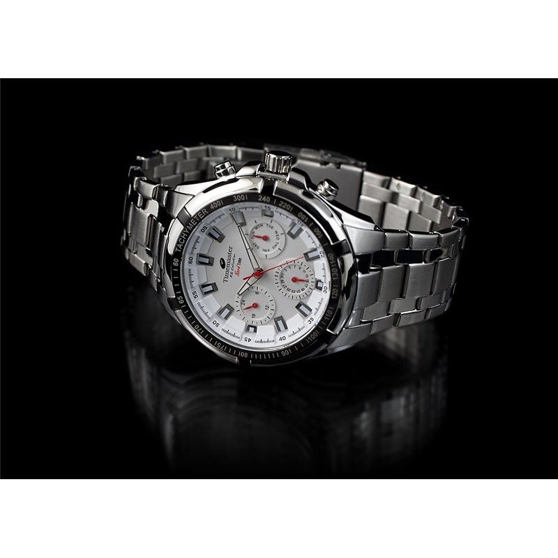 Zegarek wykonany z wysokiej jakości stali nierdzewnej, wodoszczelny do 10 atmosfer. Koperta srebrna z czarnym ringiem, tarcza biała. Zegarek wyposażony w rozbudowany datownik.