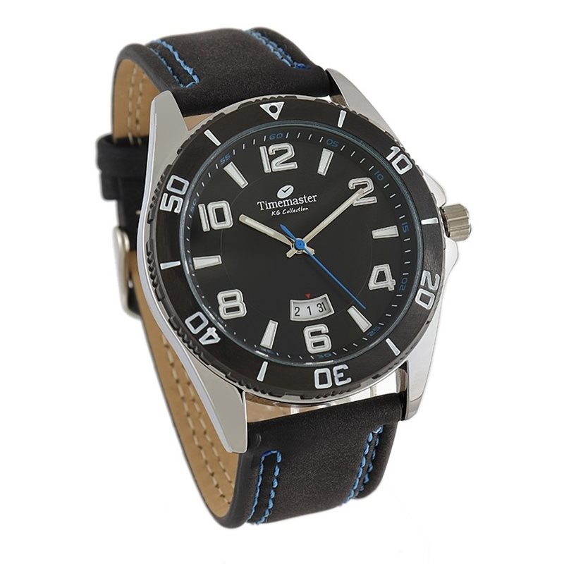 Męski zegarek na czarnym pasku z niebieskimi przeszyciami. Podziałka minutowa umieszczona na zewnętrznym ringu tarczy. Odznaczający się sekundnik w kolorze niebieskim. Tarcza z dużymi, czytelnymi cyframi.