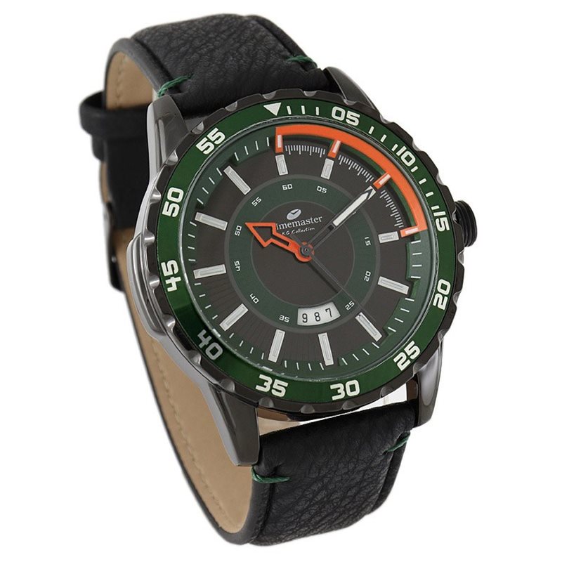 Sportowy design zegarka z akcentami w kolorze wojskowej zieleni wyposażony w datownik. Pasek z zielonym przeszyciem poprzecznym.